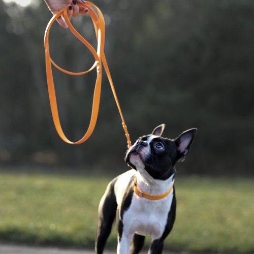 Smycz miejska – stała długość i wygodna rączka zapewniają pełną kontrolę w ruchu miejskim. Do intensywnego użytkowania najlepiej z BioThane lub TPU, które łatwo wytrzeć po spacerze.